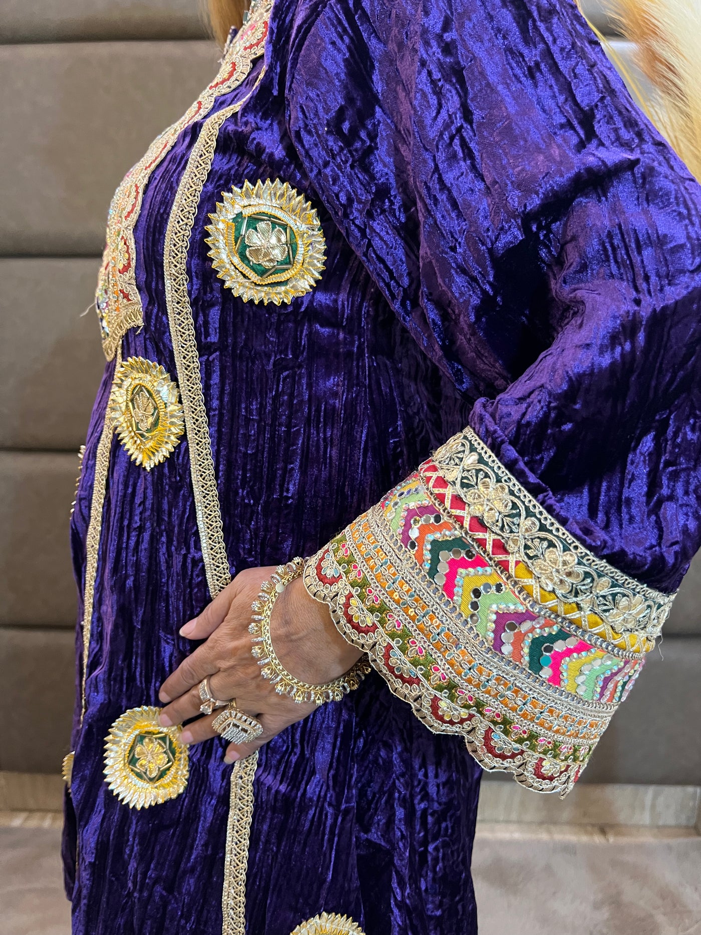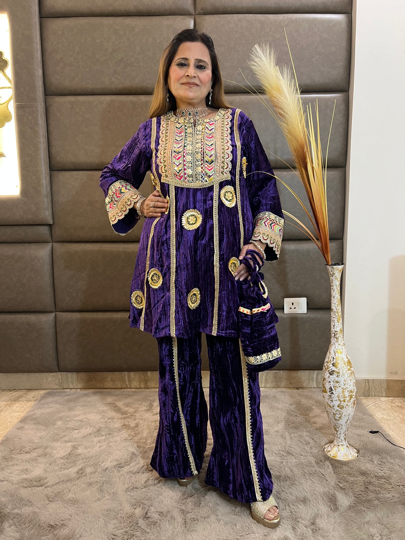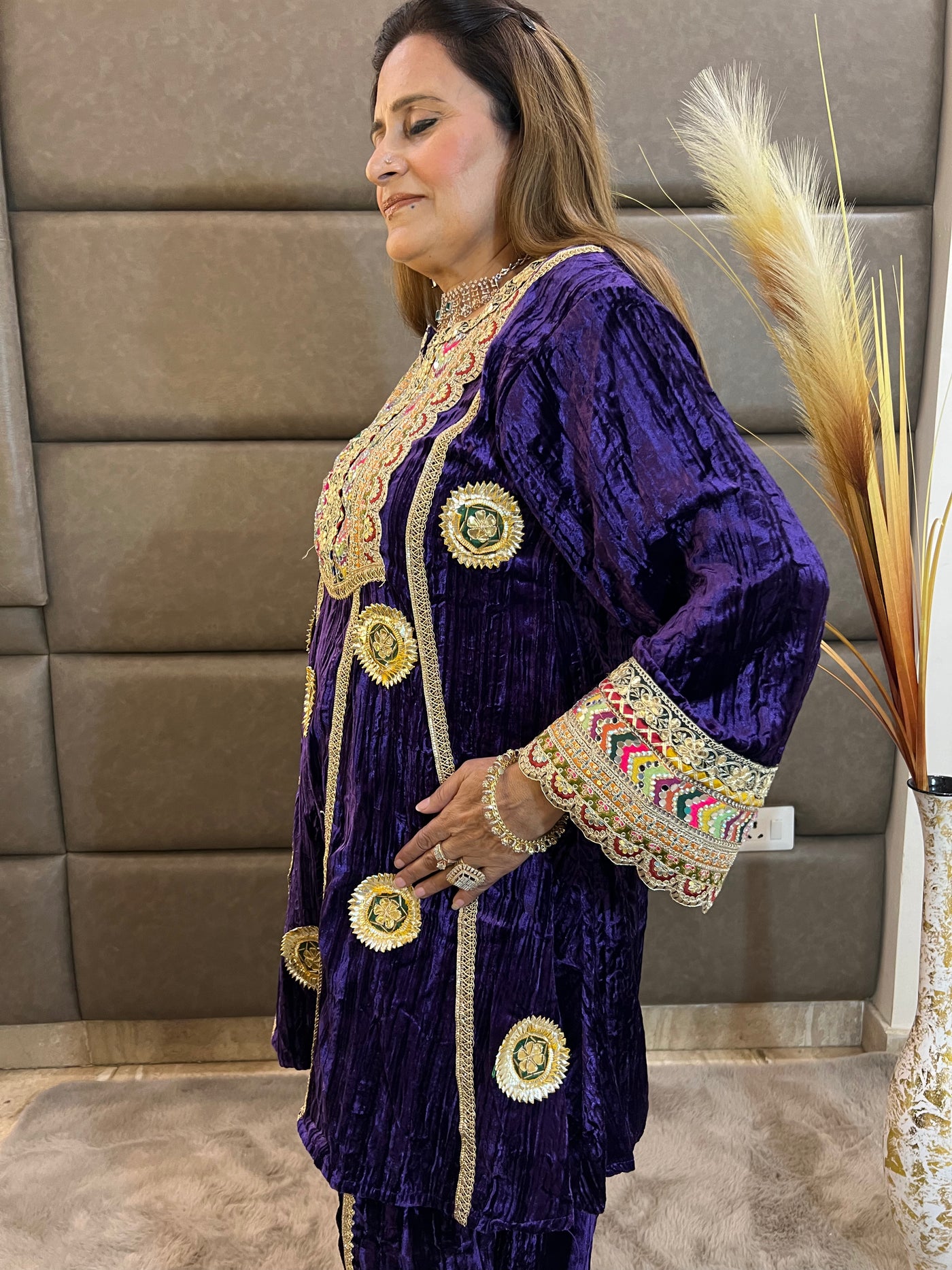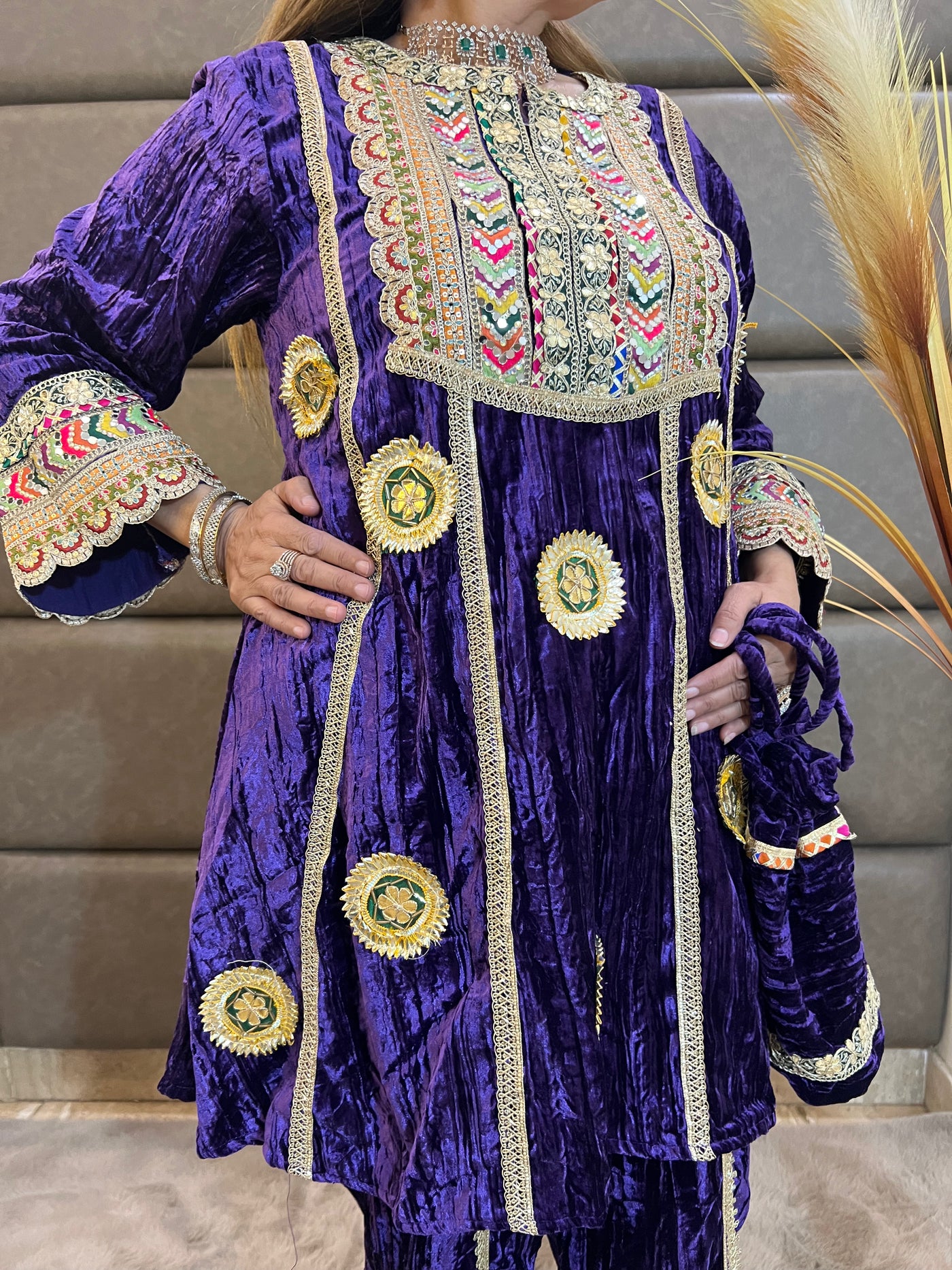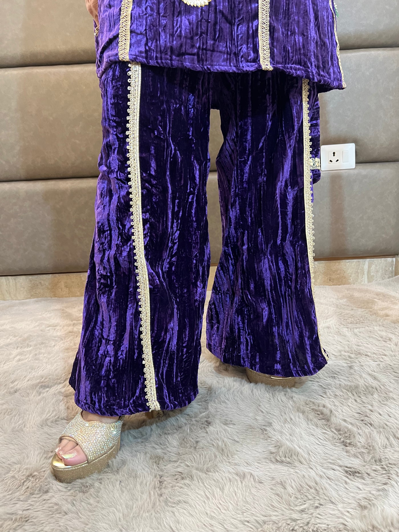 Shirt: Crushed velvet peplum with intricate embroidery detailing, featuring gota patti and mirror work on the neck, sleeves, and shirt front.