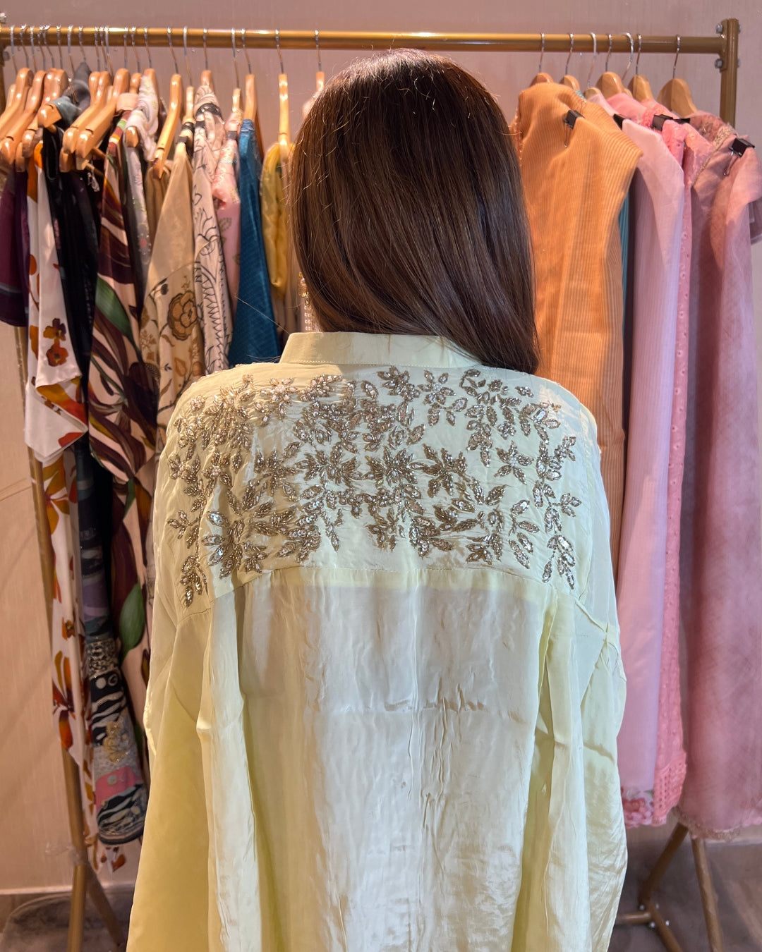 Shirt: Crafted from pure crepe with a smooth lining, this shirt features delicate handwork of pearls, sequins, and cutdana on the ghera, enhanced by stunning scalloping for a refined and elegant finish.