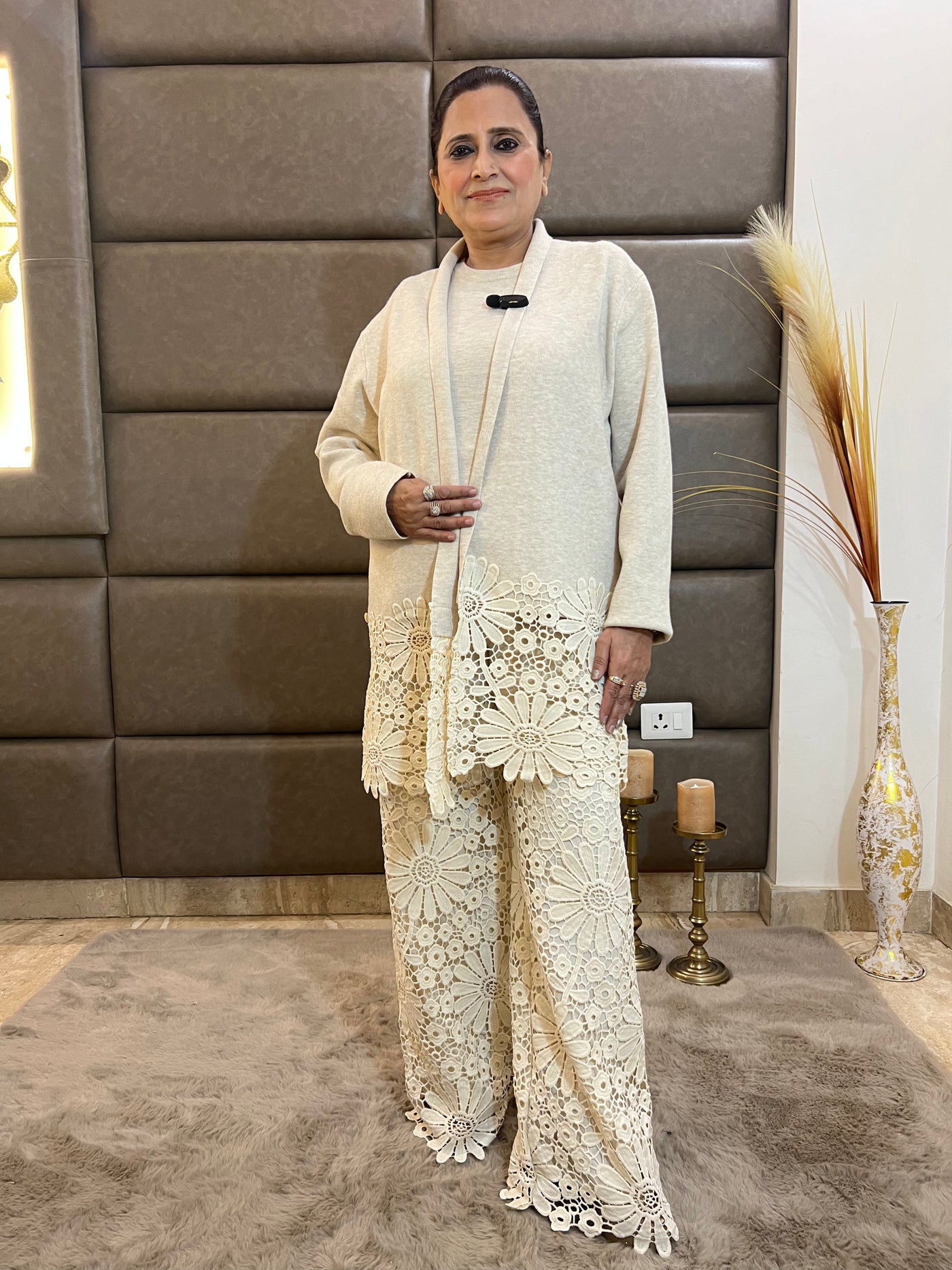 Pants: Coordinated imported wool pants with net accents, adding a sophisticated touch to your ensemble. The combination of warmth and elegance makes this set a versatile winter wardrobe essential.