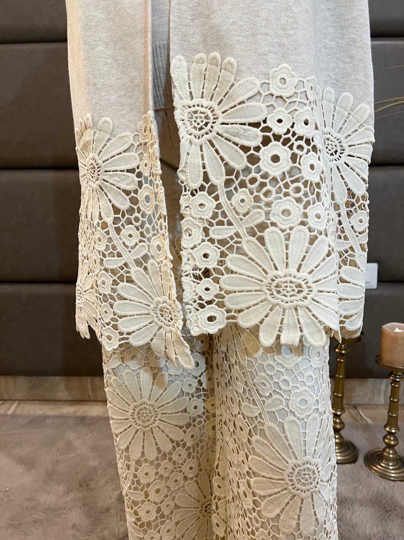 Woolen mild handwash only. Handle with care to preserve the delicate net detailing and maintain the fabric’s luxurious texture.