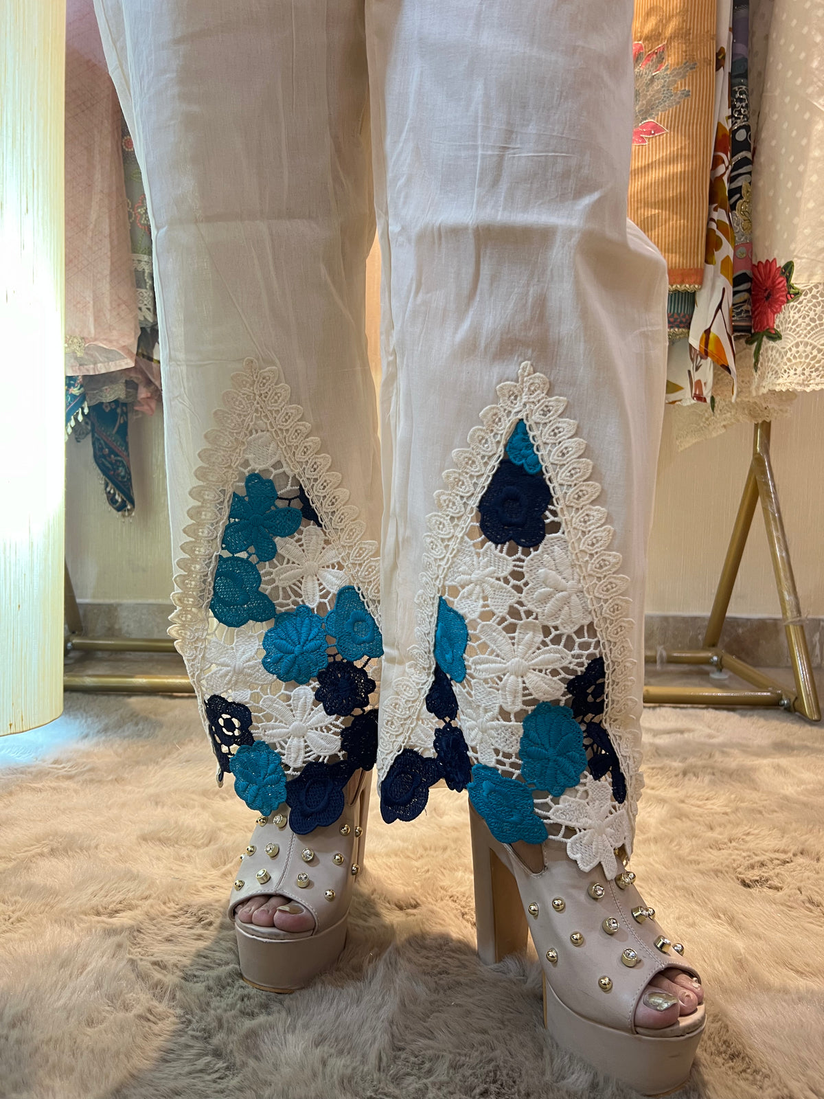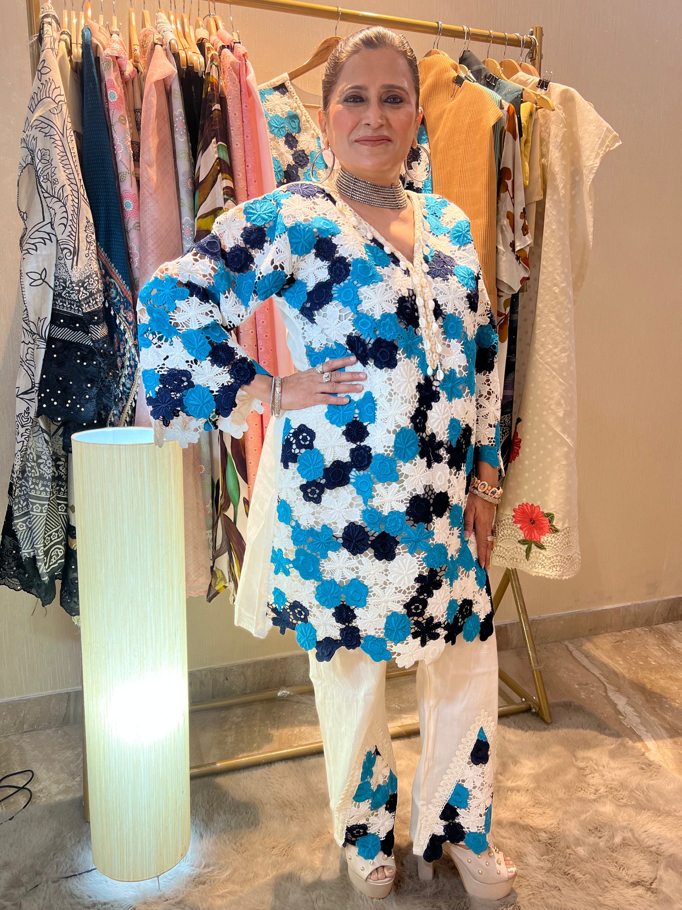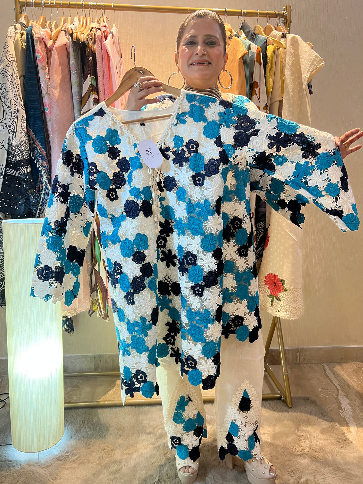 Bottom: Paired with designer cotton pants, adorned with signature cotton Schiffli patchwork, creating a perfect balance of elegance and artistry.