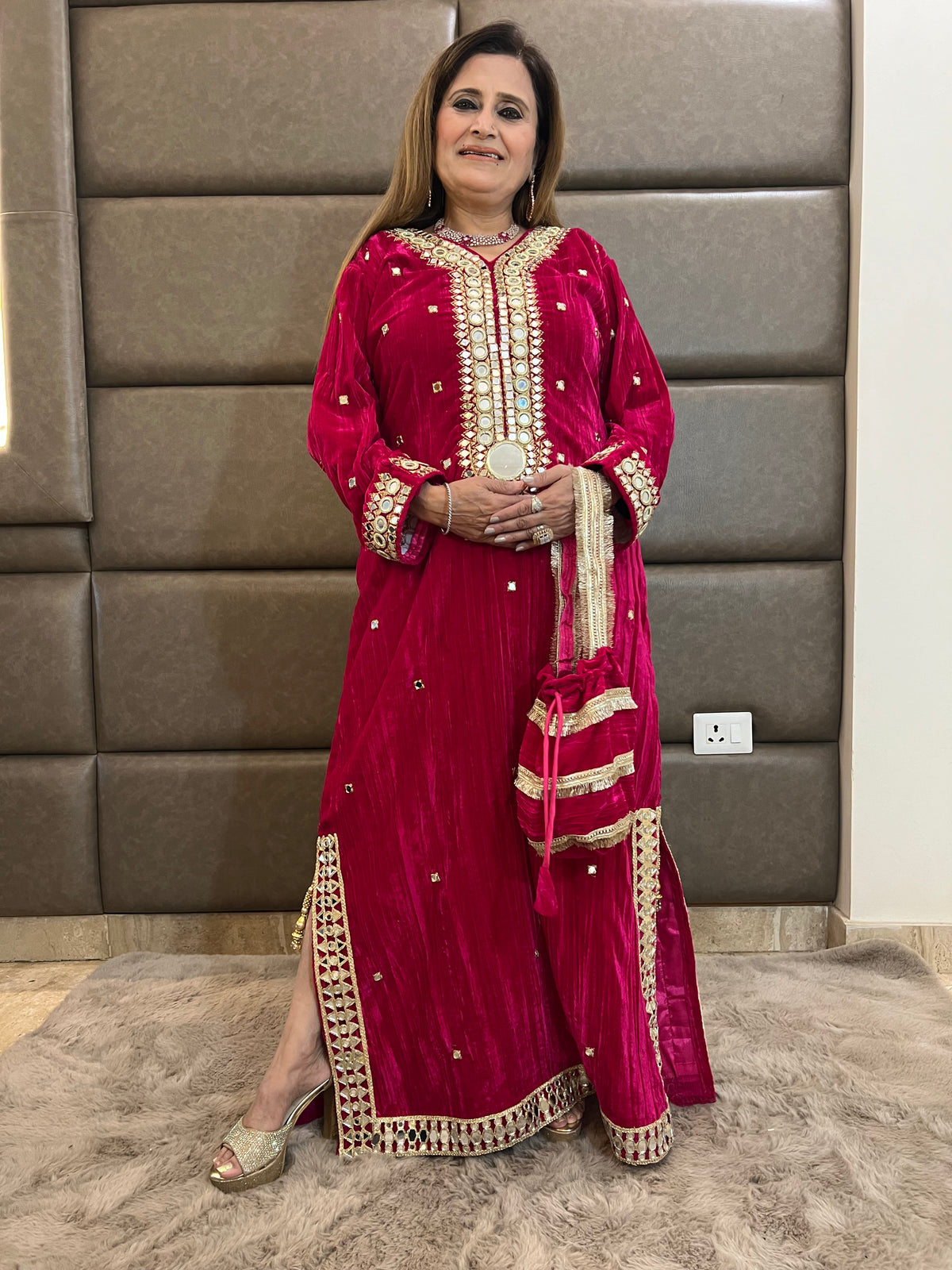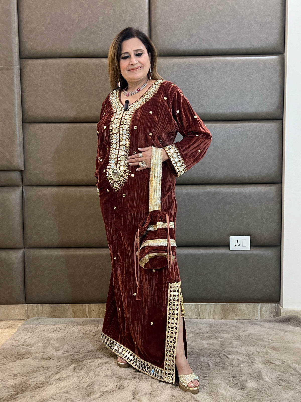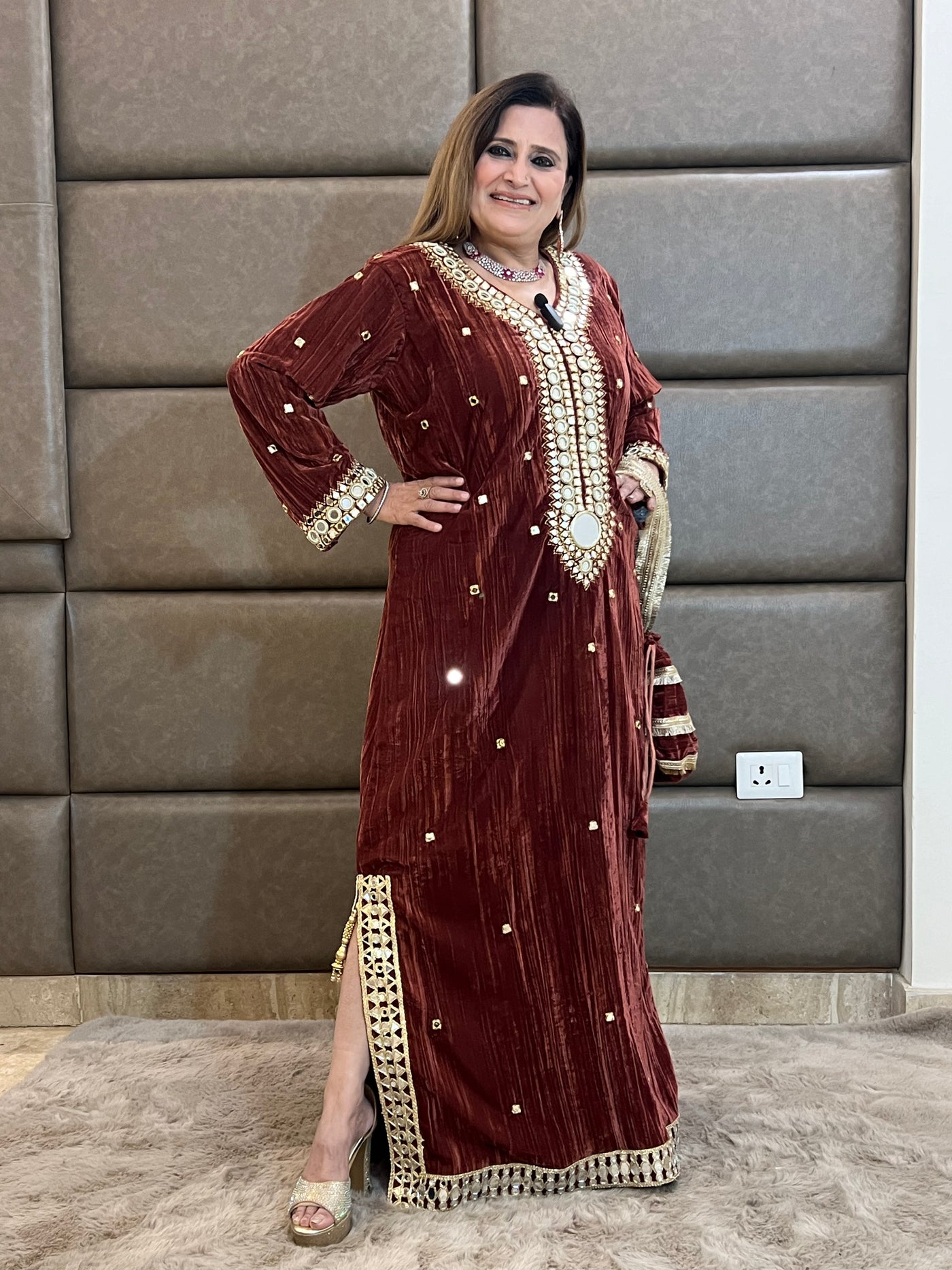 Dry clean only. Handle with care to preserve the velvet’s luxurious texture and intricate mirror work.